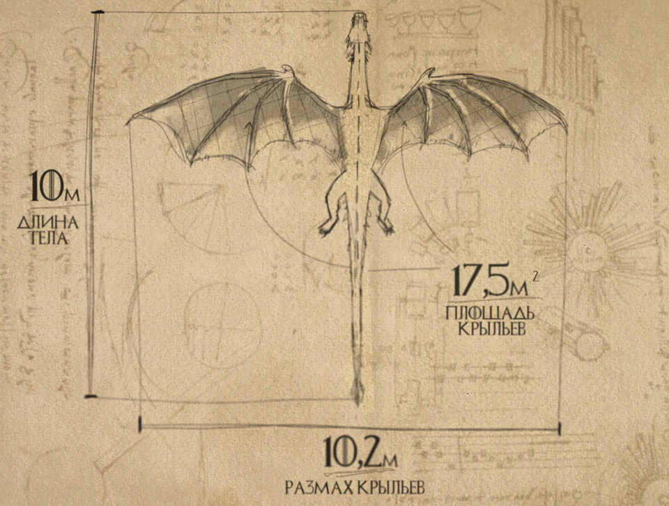 По сериалу составить «портрет» дракона достаточно просто, а при определенном желании можно даже измерить некоторые его параметры. Например, сопоставив ящера с ростом человека, можно оценить его длину, а просмотрев несколько сцен с секундомером в руках — прикинуть частоту взмахов крыльями. Поскольку на протяжении всего повествования в книге и сериале упоминается несколько драконов всех цветов и размеров, мы решили остановиться на любимце Дейнерис Дрогоне, заполучившем больше всего экранного времени. А в качестве примера полета мы выбрали сцену из девятой серии пятого сезона, в которой Дрогон героически спасает Дейнерис от Сынов Гарпии.