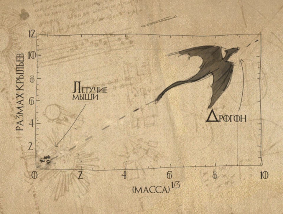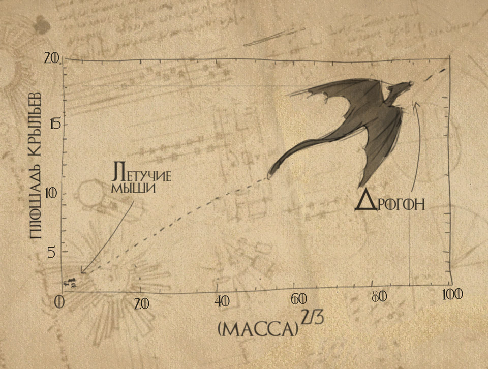 Следующий шаг — размах и общая площадь крыльев. Тут мы снова обратимся к работе о летучих мышах. Мы использовали данные об их общей массе в качестве калибровки, а затем экстраполировали эту зависимость к предполагаемой массе Дрогона. Получилось, что размах его крыльев составляет примерно 10,2 метра, а площадь крыльев (у летучих мышей ее аккуратно измеряли по миллиметровке!) — 17,5 квадратных метров. Это неплохо соотносится с кадрами из сериала, поэтому мы не стали дальше заморачиваться, а перешли к самому интересному — аэродинамическим оценкам.