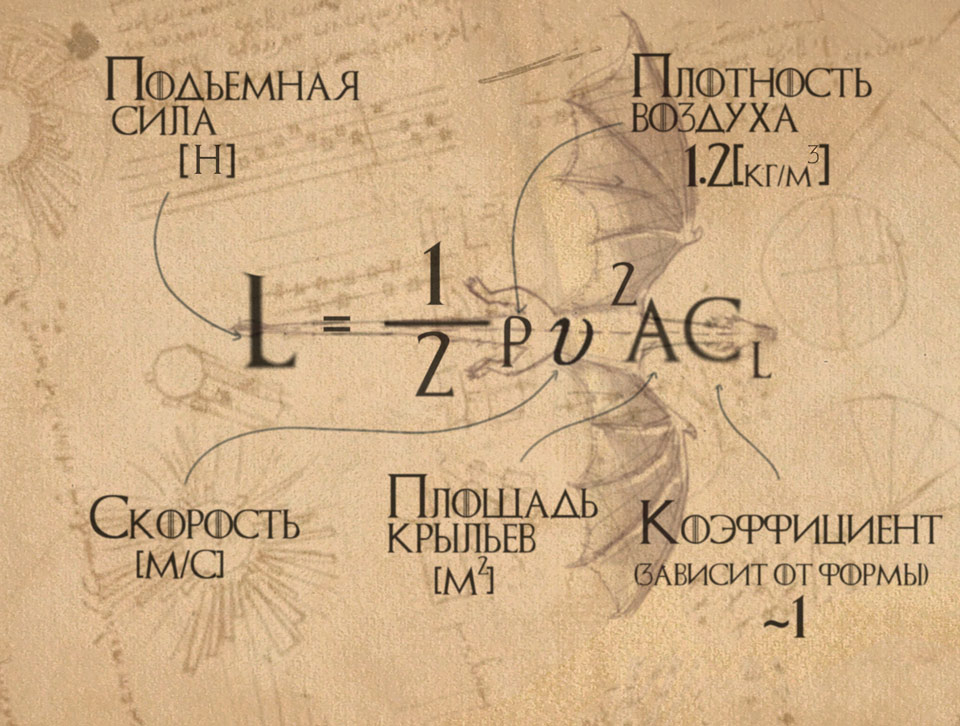 Уравнение подъемной силы выглядит следующим образом: сила пропорциональна квадрату скорости (относительно воздуха), площади крыла и плотности воздуха. При этом еще существует коэффициент подъемной силы CL, значение которого определяется формой объекта и углом атаки: углом между плоскостью крыла и направлением набегающего потока воздуха. Если подъемная сила, рассчитанная по этому уравнению, сравняется с силой тяжести — объект будет висеть в воздуха. Если подъемная сила превысит вес — объект взлетит.